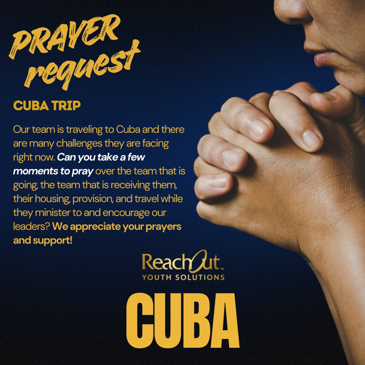 PRAYER REQUEST FOR CUBA Our team is traveling to Cuba and there are many challenges they are facing right now. Can you take a few moments to pray over the team that is going, the team that is receiving them, their housing, provision, and travel while they minister to and encourage our leaders? We appreciate your prayers and support! . 👉 FOLLOW us to see more of what we do around the globe! . ❓Reach Out and Jesus-Focused Youth Ministry: reach-out.org . 📰NEWS: reach-out.org/subscribe . #reelsinst